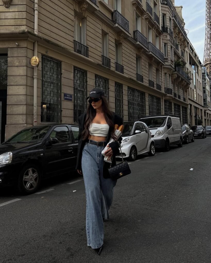 This all-black moment feels so effortlessly cool. The crop top shows just a hint of skin while the classic blue baggy jeans keep things relaxed and comfortable. The baseball cap adds a sporty element that makes this look perfect for casual outings, weekend activities, or any time you want to look put-together without trying too hard.