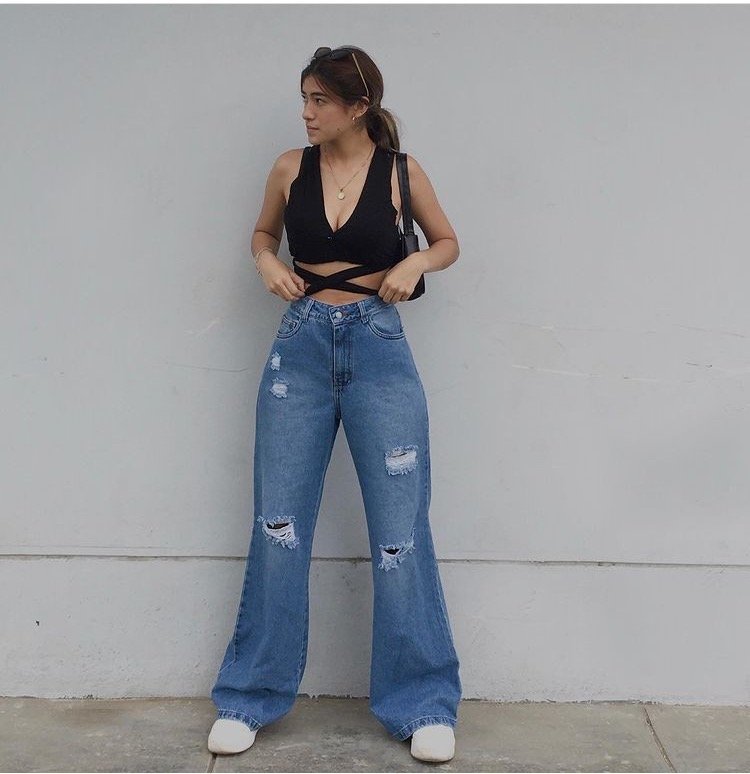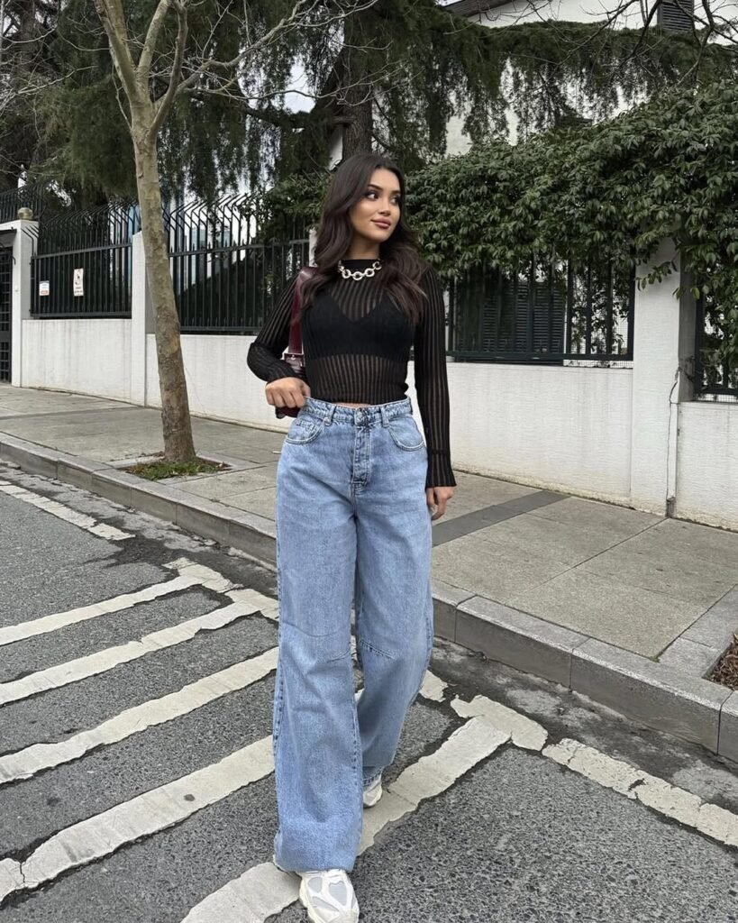 This black top and distressed denim combo creates the perfect baggy jeans outfit aesthetic. The strategic rips add texture and visual interest, while the wrap-style black top brings a feminine touch to the relaxed silhouette. It’s edgy enough for concerts but polished enough for casual dinner dates exactly the kind of versatile piece every wardrobe needs.
