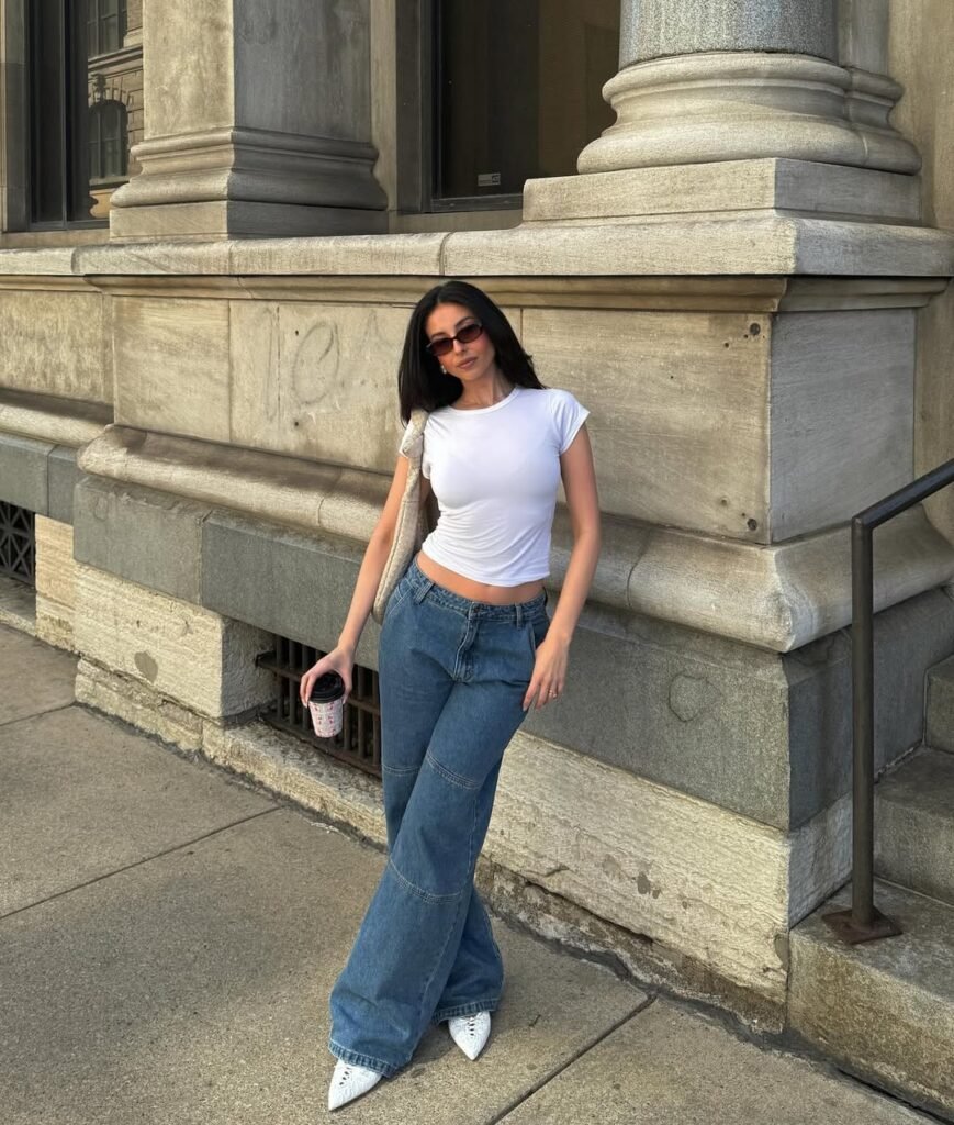 This halter-style white top paired with light blue baggy jeans creates such a fresh, summery vibe. The contrast between the fitted top and relaxed bottom is fashion gold it’s all about that balance. This baggy jeans outfit aesthetic is perfect for warm weather days when you want to look polished but stay comfortable.