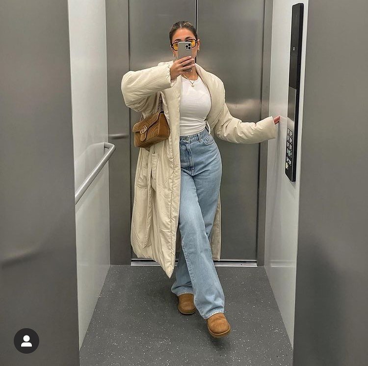 Elizabeth convinced me to try this long coat styling trick, and now I’m obsessed. This baggy jeans outfit winter look proves that oversized doesn’t mean frumpy. The long beige coat adds sophistication while the fitted white top underneath creates shape. The light wash denim keeps the whole look from feeling too heavy perfect for transitional weather styling.