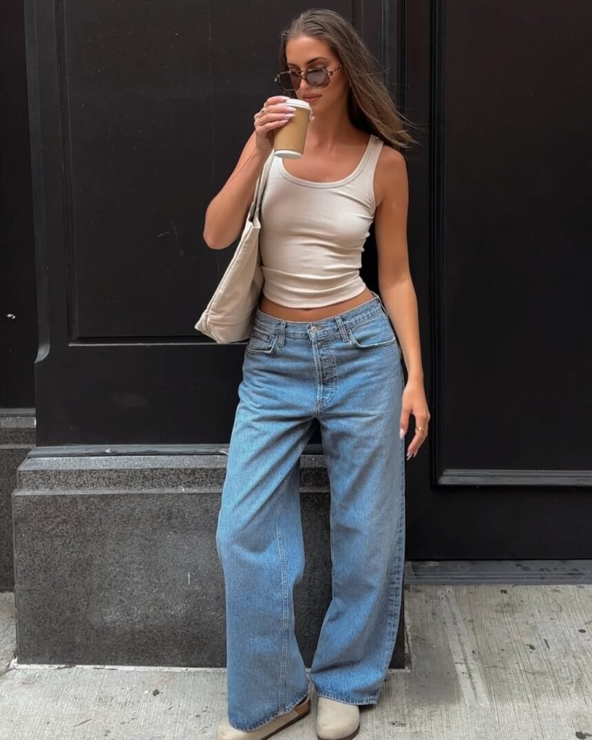 This blue baggy jeans outfit strikes the perfect balance between relaxed and put-together. The light wash denim paired with a beige fitted tank creates that effortless cool-girl aesthetic that’s all over social media. The neutral tones make this look incredibly versatile perfect for coffee dates, casual shopping trips, or weekend brunches when you want to look stylish without trying too hard.